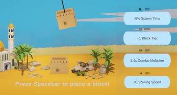 A quick, skill-based tower builder where every click matters. Drop blocks as precisely as you can—the closer to the center, the more points you earn. Chain perfect center placements to build a combo multiplier and push your score into the sky.