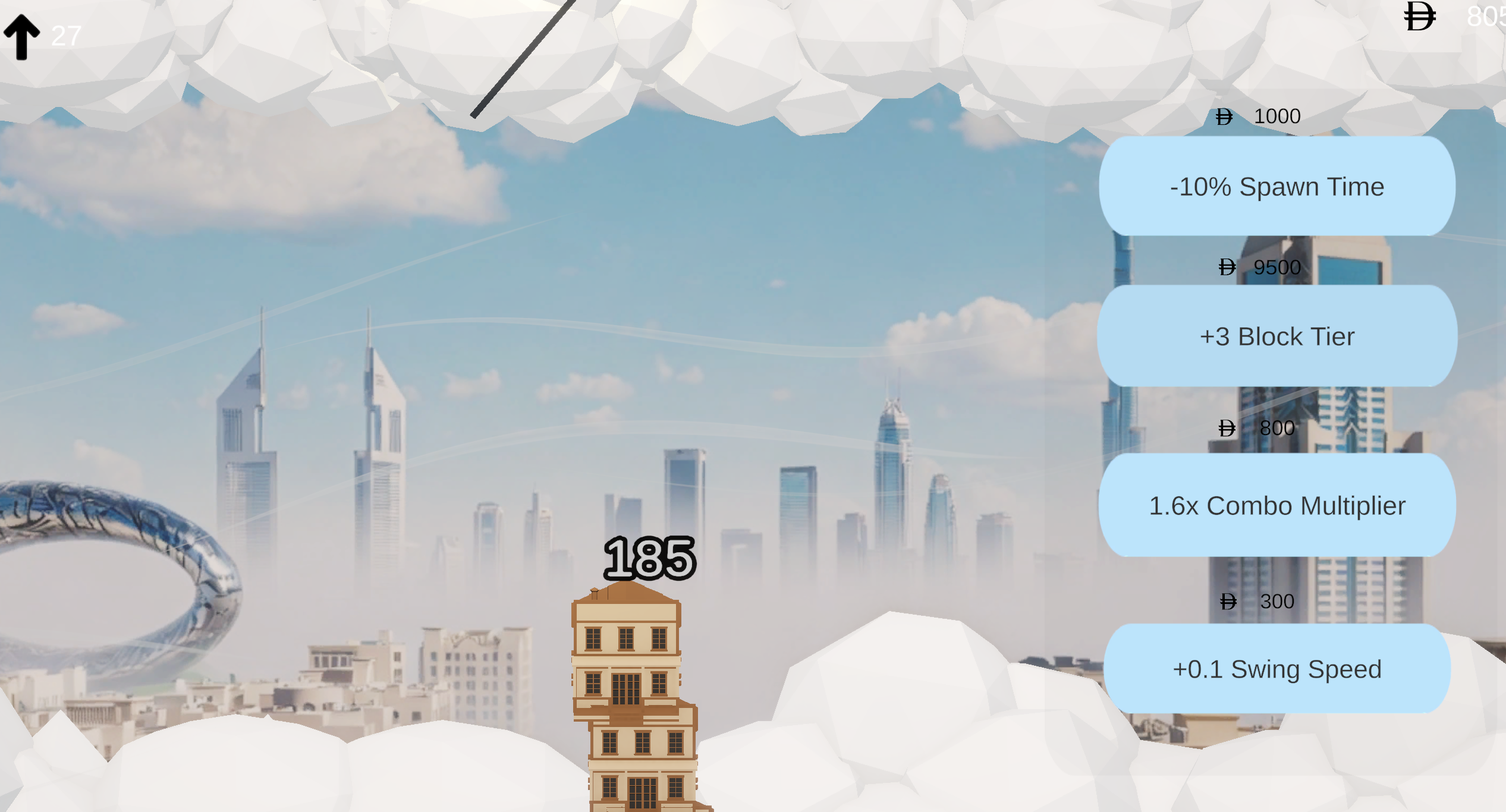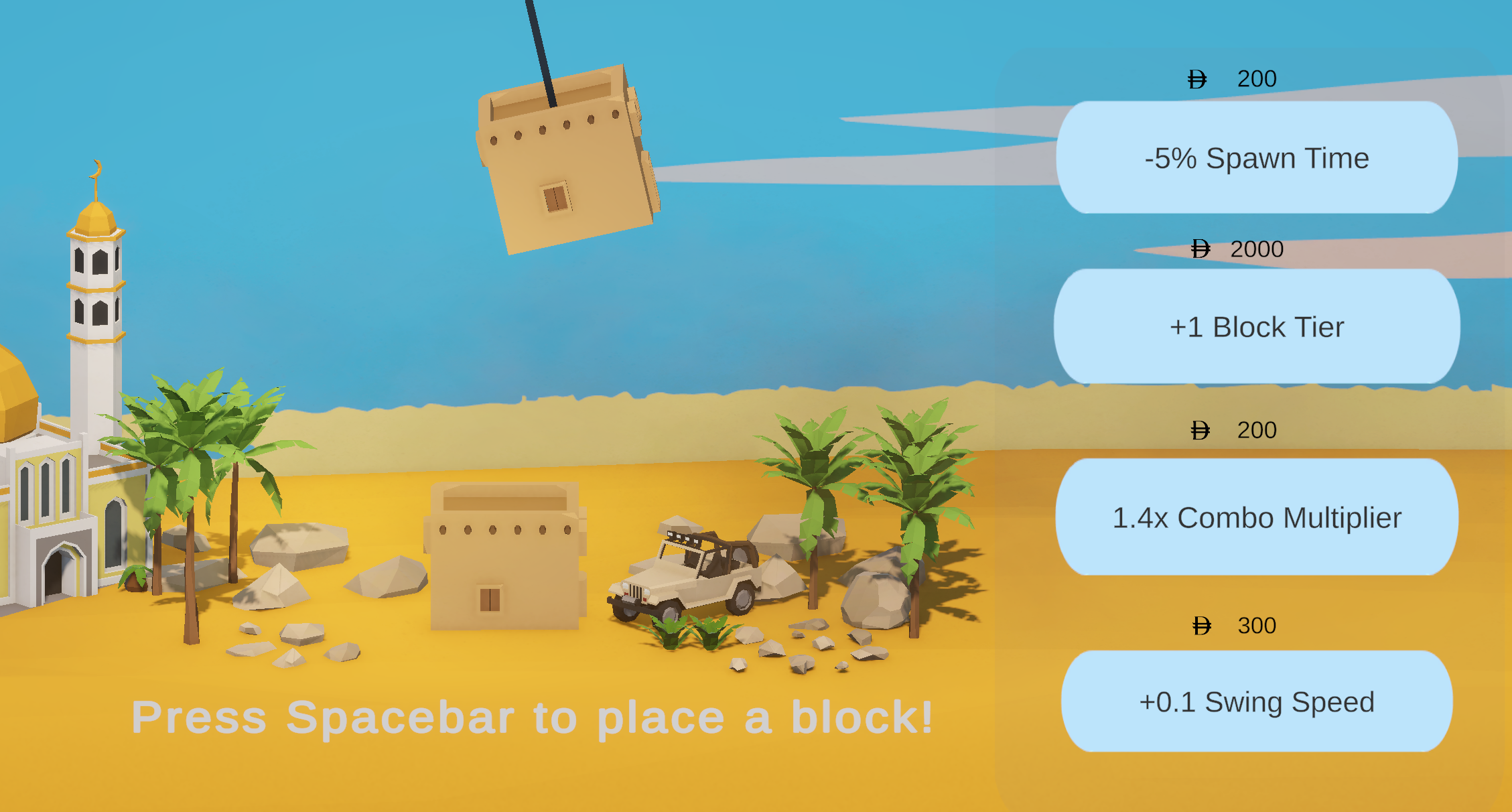 Desert Ascent is about contrast: you start grounded and simple, then rise into modern Dubai. The higher your tower grows, the more the world shifts from sand-level calm to skyline height—all through clean, focused, precision gameplay.